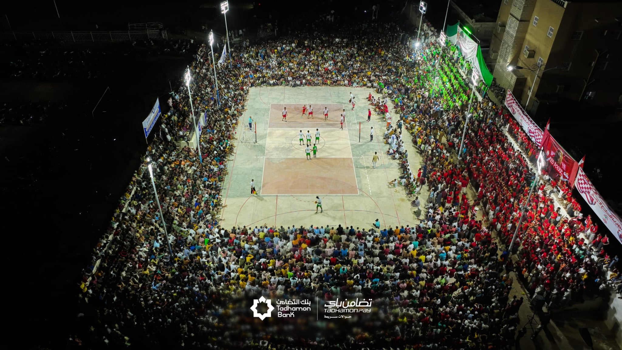 Sponsored by Tadhamon Pay Fast Remittance Service from Tadhamon Bank, and Attended by a Large Crowd Watching the Semifinal Matches of the Eid Al-Fitr Volleyball Championship in Tarim City
