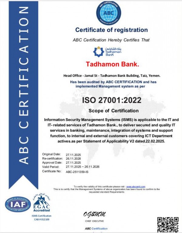 بكل فخر، يواصل بنك التضامن ترسيخ مكانته الريادية في إدارة أمن المعلومات، مجددًا شهادة ISO/IEC 27001:2022 وفق أعلى المعايير العالمية، تأكيدًا لالتزامه بتطبيق أفضل الممارسات الدولية في حماية البيانات.